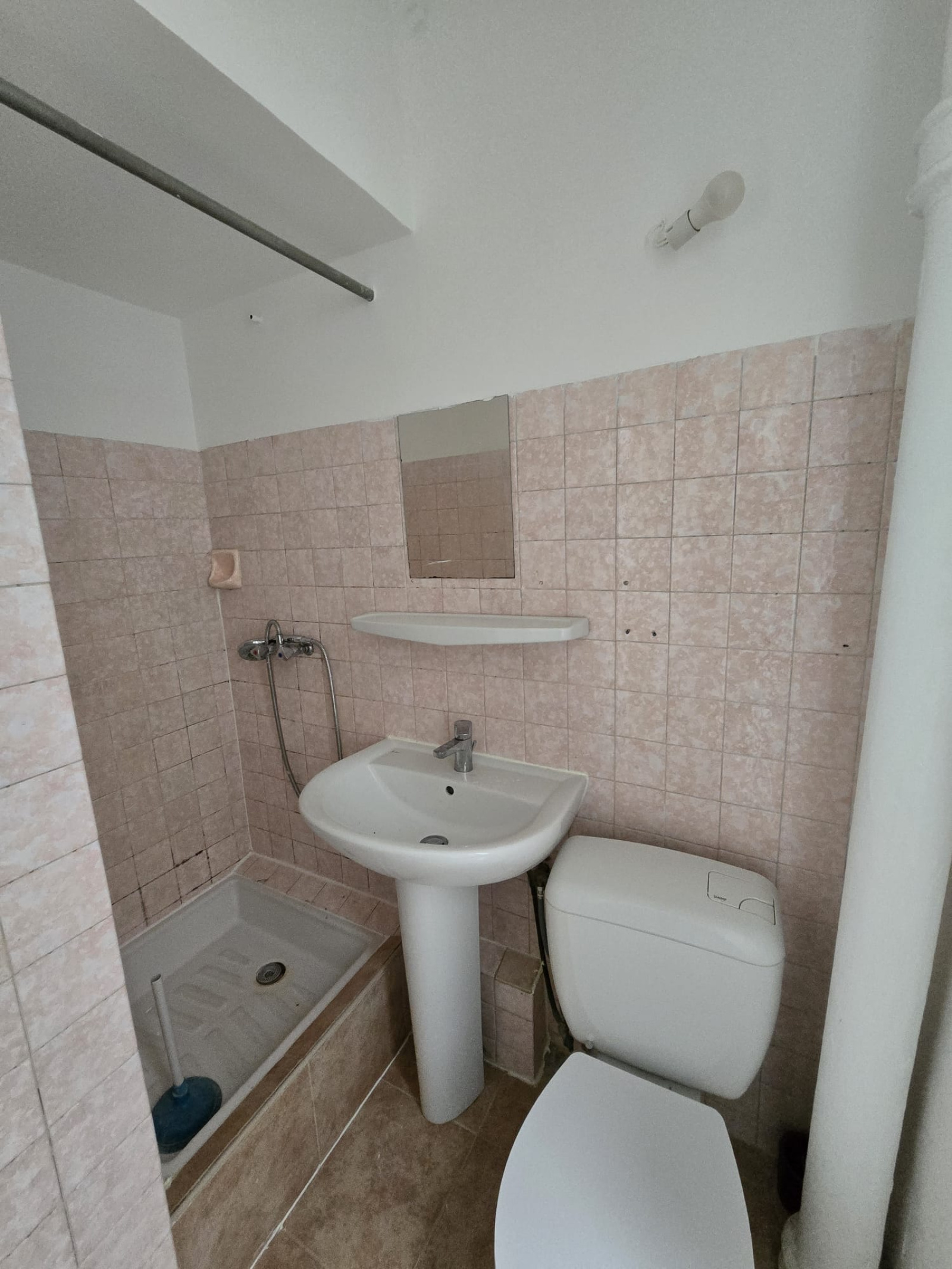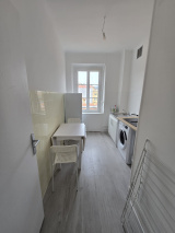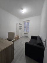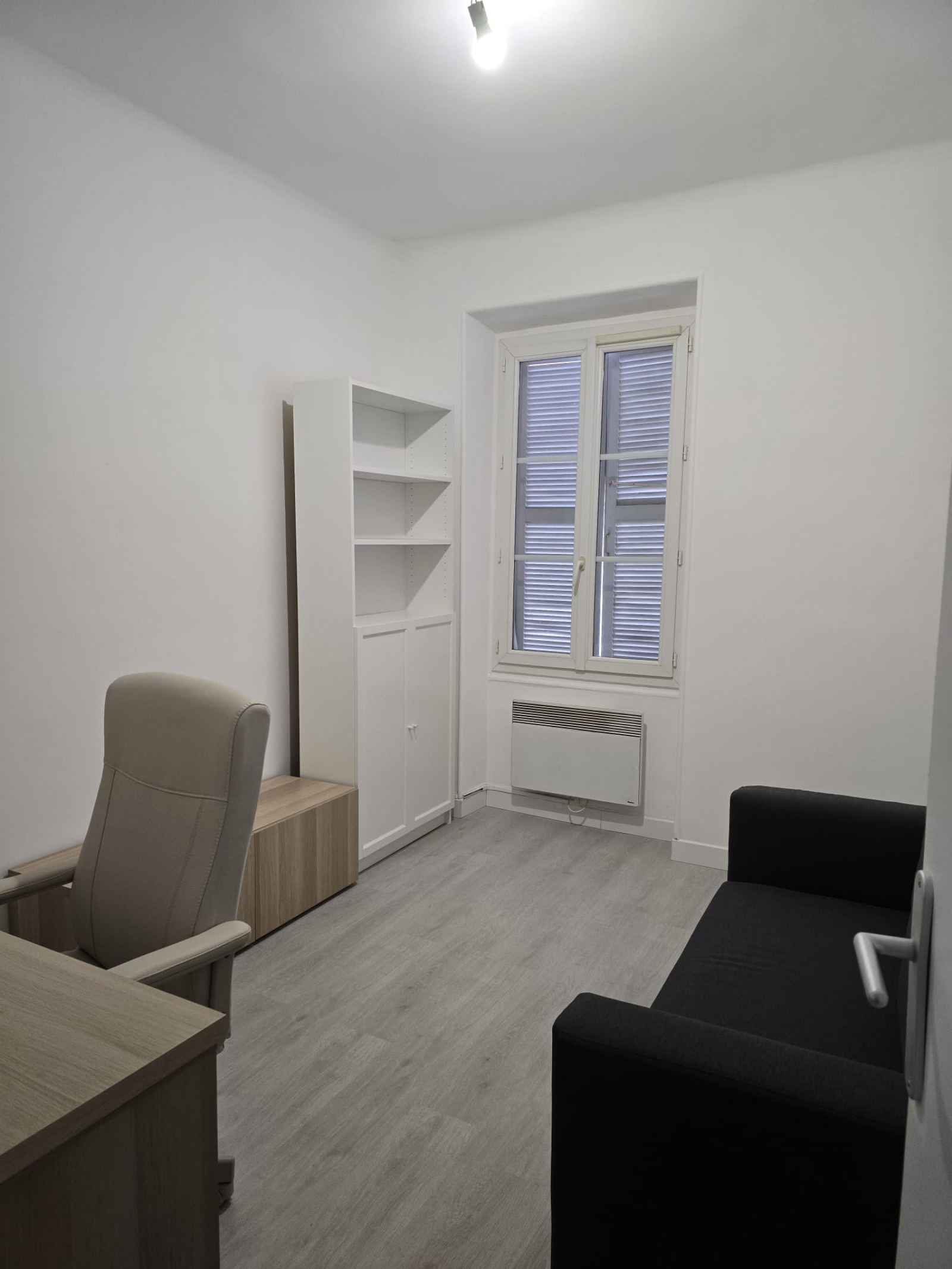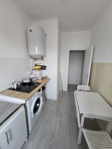 Il se compose d’une entrée avec placard, d’un séjour (canapé, bureau, bibliothèque), d’une cuisine, d’une chambre (lit double 160 cm, armoire) et d’une salle d’eau avec WC.